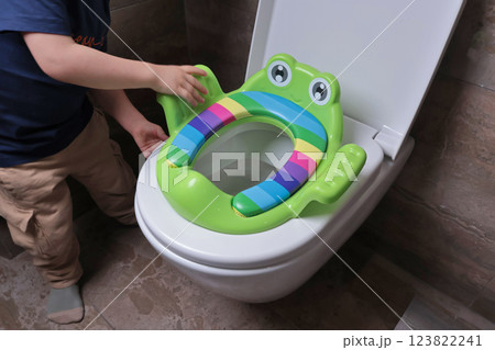 Child place fun frog-shaped baby seat on toilet in bathroom. Development of self-care skills. Daily regimen.