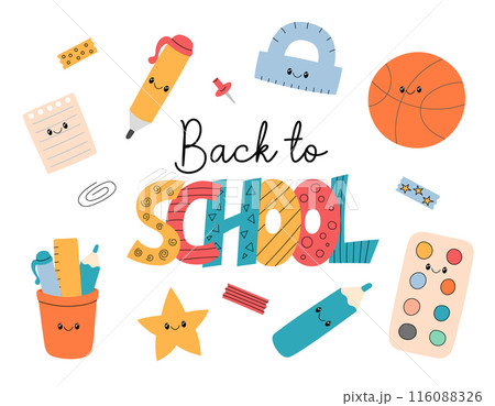 Back to School vector set. Illustration for first day of school. Cute office supplies composition. Funny stationery elements. Colorful hand drawn collection