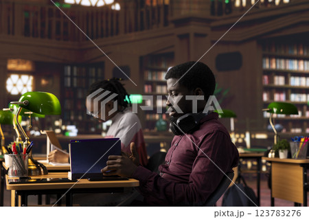 African american male student opening his textbook to complete his handwritten class notes with information from specialty books at the university library. Young adult reading academic papers.