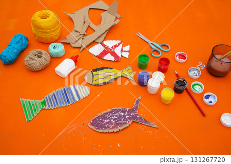 Make a fish out of cardboard, thread, and paint, following step-by-step directions, with an orange background.