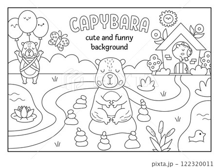 Vector black and white horizontal scene with capybaras. Landscape line illustration with capibaras. Cute background or book cover for kids with animals. Funny scene, coloring page for kids