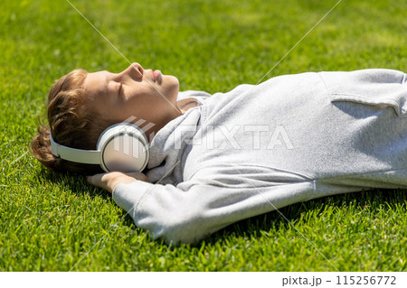Practicing yoga, two multiracial boys meditating on mats outdoors at school field