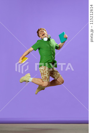 Young guy dressed casual summer attire jumping of joy and happiness holding books against purple background.