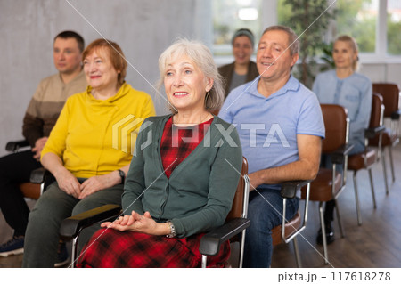 Positive woman admires the works of art on display while walking through the spacious hall of museum