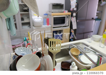 散らかったキッチン溜まった洗い物共働き子育て家事分担イメージ写真素材
