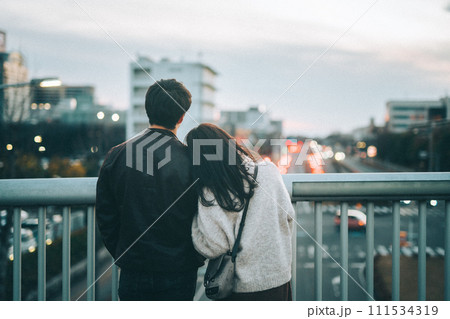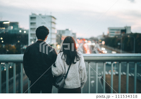 夕暮れ時に歩道橋から街中を眺めるカップル