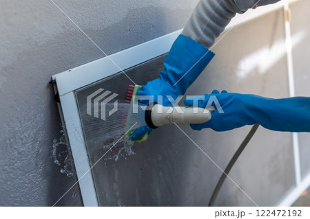 網戸を洗う男性 DIY 大掃除