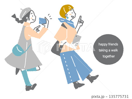 友達とのお出かけを楽しむ若い女性 やわらかいタッチのお洒落なシンプルイラスト