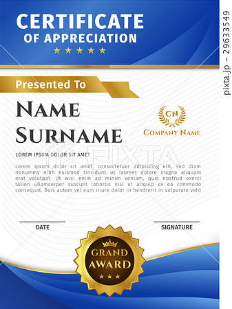 Elegant certificate of achievement set in vertical and horizontal layout, classic blue and gold border design, professional award template for business, corporate, education and formal recognition.