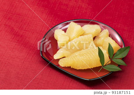 おせち料理その9-02_黒皿の数の子_背景赤と金