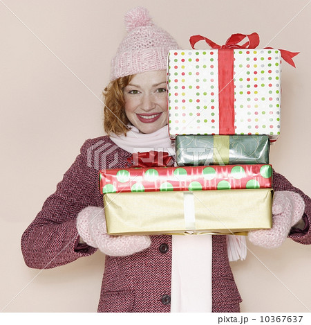 Woman holding stack of presents