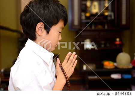 数珠を持って合掌する喪服姿の少年 斜め