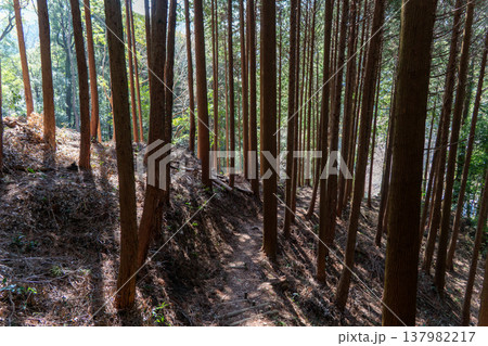 金剛山の杉林に立ち並ぶ木々と山の静寂な風景