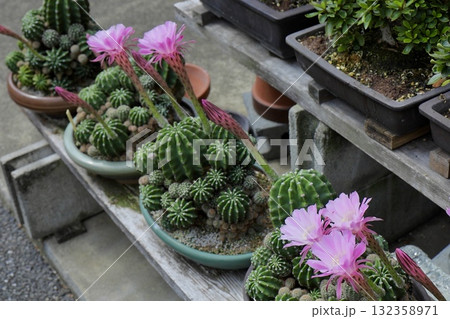 ピンクの花の咲いたサボテンが並ぶ盆栽棚