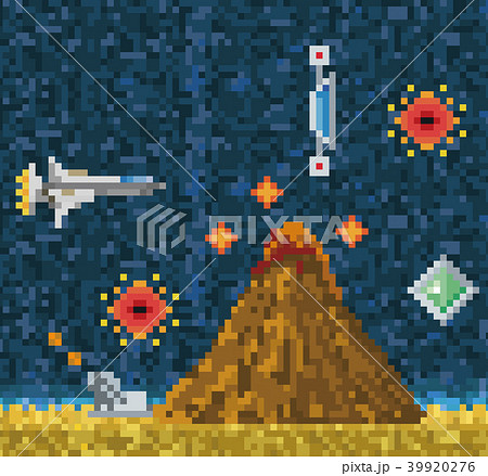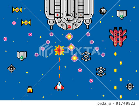 Space battle arcade game level. Pixel art galactic battle, defender spaceship and pixelated ufo enemies vector Illustration