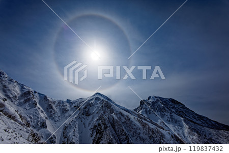光環と厳冬の八ヶ岳連峰・阿弥陀岳