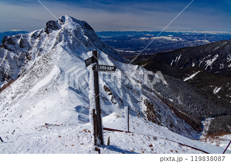 雪の八ヶ岳連峰 赤岳と赤岳頂上山荘 遠景
