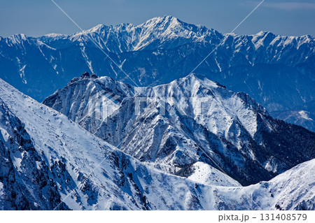 八ヶ岳連峰・硫黄岳稜線から見る厳冬の権現岳と南アルプス・北岳