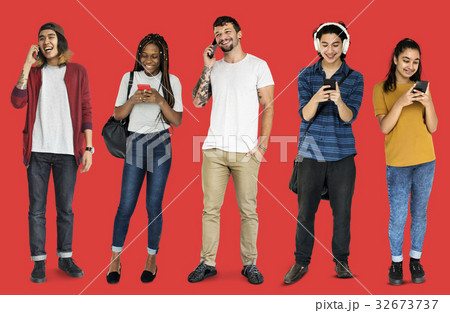 Various of diversity people standing using digital electronic on background