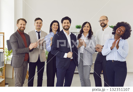 Interracial joyful team clapping hands for business man, close-up
