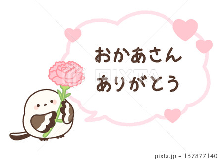 母の日のカーネーションを持つシマエナガの吹き出し(おかあさんありがとう)