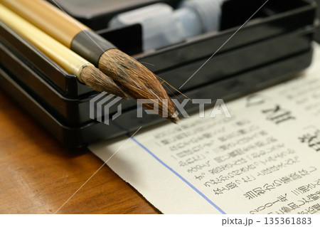 書道道具の筆と手本テキストのクローズアップ
