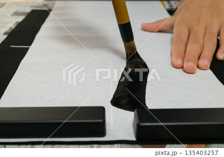 書道で半紙に筆を置く瞬間の手元のクローズアップ