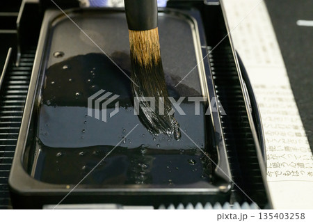 硯の海で墨をたっぷり含ませる書道の筆先