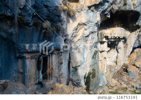 Ancient Lycian rock hewn tombs in stone cliff in Pinara, Turkey