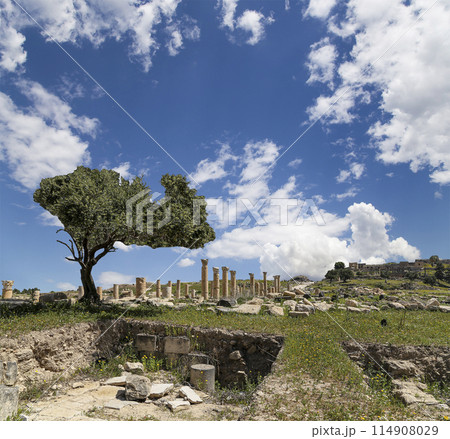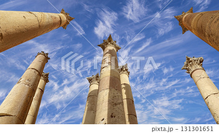 Roman Columns in the Jordanian city of Jerash (Gerasa of Antiquity), capital and largest city of Jerash Governorate, Jordan. Against the background of a beautiful sky with clouds