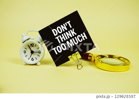 Don't Think Too Much text message on sticky note with magnifying glass and alarm clock on yellow background