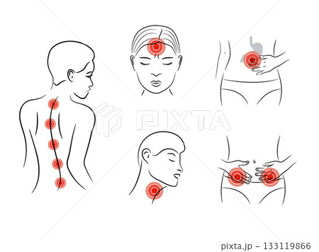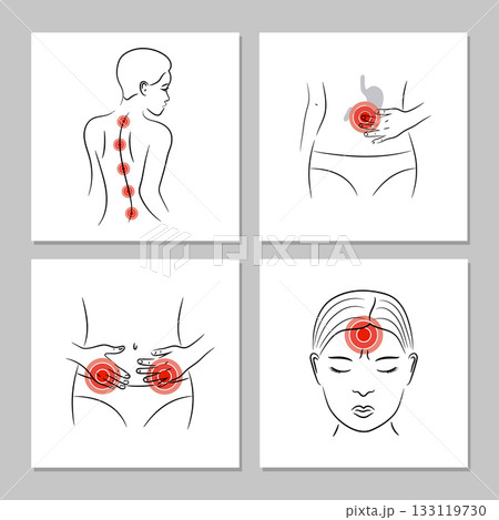 Pain point icons set. Pain red circles mark. Target spot symbols for medical design. Concept killer for headaches, abdominal aches. Editable stroke. Vector illustration isolated on white background