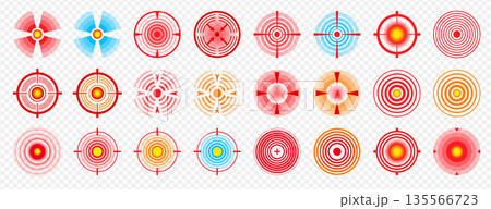 Pain localization icons. Red concentric circles. Sore or inflammation symbols. Pulse, vibration or radiation signs. Shock wave, radar or sound signal pictograms. Vector illustration