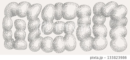 Dotwork abstract background with abstract blob, stylized intestine , black grain dotted texture. Abstract stipple sand effect, gradient backdrop from dots. Vector vintage print illustration.