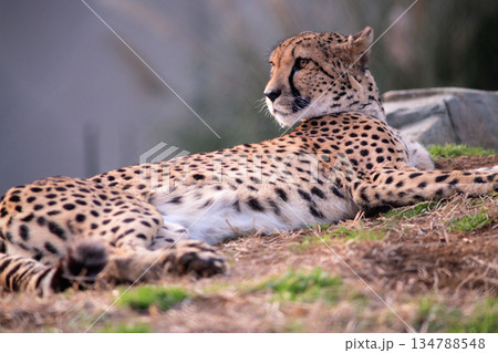 夕食を待つ間に横たわって遠くを眺めるチーター