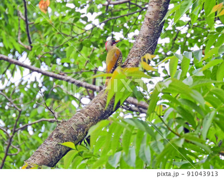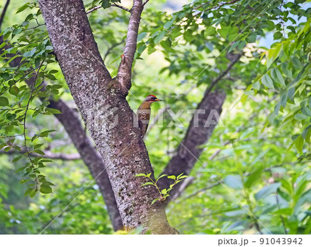 アカマツの幹にとまるキツツキ目の野鳥頭が赤いアオゲラ