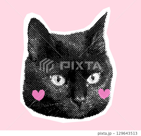Cute black cat face, vector halftone collage animal, funny kitty head graphic design element