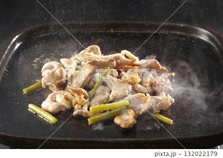 親鶏とにんにくの芽炒め 鉄板で焼いているシーン