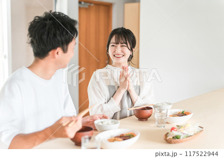 家で食事をして妻を褒める夫婦・カップル(美味しい・自炊)