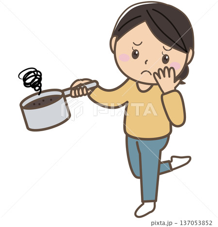 料理失敗で焦げた鍋に困る女性イラスト