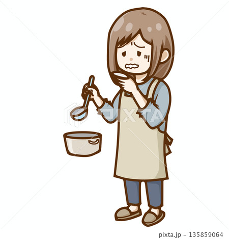料理の味見をする女性のイラスト2パターンセット(笑顔・顔をしかめる)