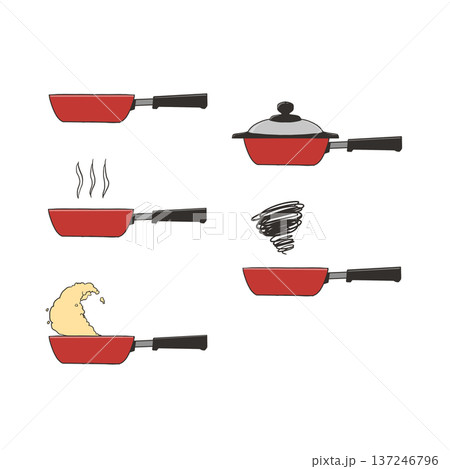 赤い鍋と吹きこぼれと湯気 水彩風手描きイラスト