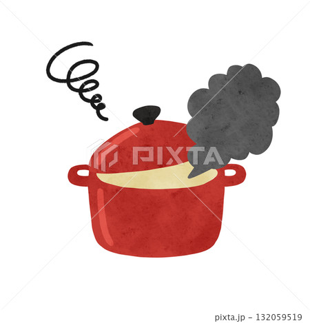 赤い鍋と黒い煙 水彩風手描きイラスト