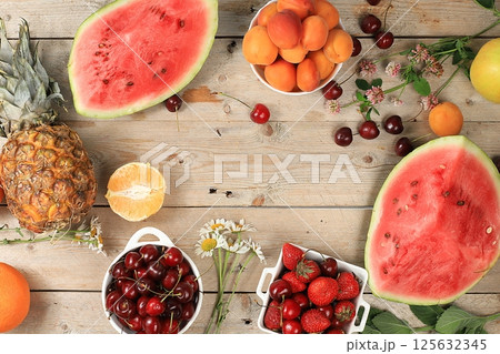 Summer berries and fruits on wooden background, harvesting in the village, healthy natural food concept, breakfast with ingredients, top view, shop advertisement, business card for cafe, selective
