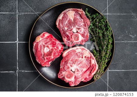 Raw Lamb Gerdan, lamb neck chops on a plate with herbs. Black background. Top view