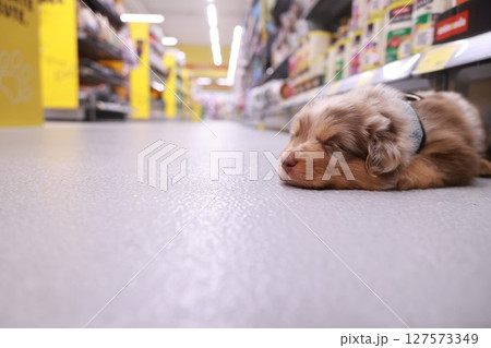Cute brown dog is laying on the floor of a store