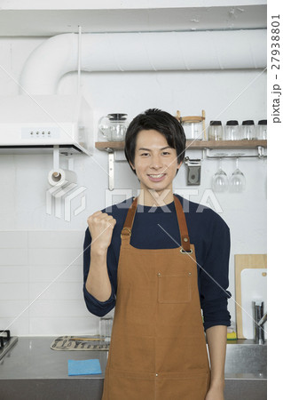 料理男子イメージ ガッツポーズするエプロン姿の男性 おうち時間
