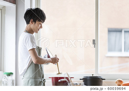 キッチンで料理するエプロン姿の若い男性 料理男子イメージ