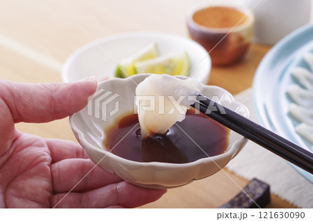 ふぐ刺しを箸で持ち上げる
