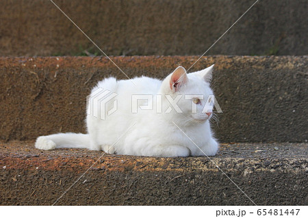 白とグレーのミックス猫が香箱座りを斜め上から背景に草をいれて